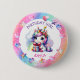 Cute personalized little girl's birthday party paper button with an adorable cartoon rainbow unicorn with a birthday hat on holding a gift with a rainbow in the background.