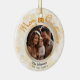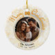 Celebrate the season with this exquisite personalized Christmas ornament featuring a soft white background adorned with delicate gold snowflake patterns. At its center is a customizable circular photo frame bordered by a subtle gold ring, perfect for showcasing a cherished family portrait. "Merry Christmas" is elegantly written in gold cursive along the top edge, adding a festive touch. Below the photo, personalize with your family name and member names for a unique keepsake. A gold ornament hook and bow detail complete the design, making it an elegant and heartfelt addition to your holiday décor.