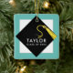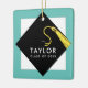 Graduation memento gift and Christmas ornament featuring classic black graduation cap and gold tassel design on teal blue background. To personalize edit text to add graduate's name and the senior class year.