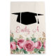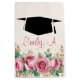 Celebrate academic achievement with this elegant graduation gift bag. Featuring a stylish black graduation cap at the top and a cursive name personalization below, this bag is perfect for honoring the graduate in your life. The bottom is beautifully adorned with pink roses, green foliage, and shimmering gold speckles, exuding sophistication and charm. Equipped with durable white rope handles, it’s the perfect vessel for presenting graduation gifts in style.