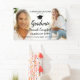 Elegant and modern script graduation banner personalized. All the text is editable. The example text reads "Congratulations to our graduate" and a before and after photo collage of the person as a child on the left and a recent one as a graduate on the right. Use this welcome sign inside for a high school or college graduation party, or outside to congratulate them. To change the photo placement: click on the button to customize it further, click on "crop", and move the image.