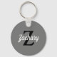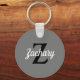 This personalized keychain features a black monogram and white retro script name on a gray background.