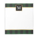Add a touch of elegance to your desk with this personalized green and black plaid notepad. The bold plaid design, featuring rich green and black hues with golden accent lines, is both stylish and sophisticated. The customizable monogram at the top ensures it’s uniquely yours. Perfect for personal use or as a thoughtful gift for friends, family, or colleagues, this notepad is ideal for jotting down notes, making to-do lists, or simply staying organized in style.