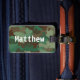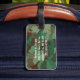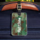 Personalized green camo luggage tag has a bold white name on the front and the person's name, address and phone number on the back. The camouflage pattern is rich vibrant green with streaks of brown and gray.