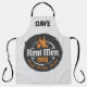 Gift for the man in your life that likes to BBQ. A gray apron with words "Real Men BBQ" with flames as a gift for a dad that likes to barbecue. Personalize it for the man in your life.