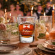 An old-fashioned whiskey glass with a classic shape. The glass is printed with the name or initials of the groom, along with a wedding date. A personalized gift for celebrating and toasting on the batch party or wedding day.