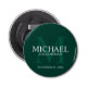 This bottle opener features personalized groomsman's name with title and wedding date in white and monogram in light emerald green as background, in classic serif font style, on emerald green background.