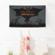 Personalized Halloween party banner. Features a scary bat like creature or monster rising out of a graveyard. Colors are black, grey, red and orange.