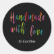 Colorful handwritten “Hand made with love” text on a black background. Personalize it with your own name by clicking on the customize button.