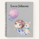 A boy and a rabbit float to space on balloons. Customizable so you can change colors and personalization. You choose interior paper but we had handwriting practice paper in mind for a pre-k student to practice handwriting.