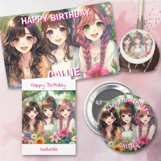 Personalized happy birthday banner. Three cute anime girl about pre-teen or teenage age, with pink and yellow flowers around them.