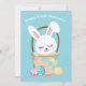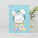 Customize this cute Happy Easter Bunny card with your own personalized text with your child's name in white script. This adorable bunny rabbit sits in a pretty Easter basket on a lovely baby blue card for children.
