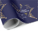 Stylish blue and gold personalized HAPPY HANUKKAH wrapping paper to wish your family and friends a Happy Hanukkah. The design shows text that says HAPPY HANUKKAH in white typography at the center, with PEACE, LOVE & JOY in gold colored typography in one corner, and also written in HEBREW in the other corner. This is set against a background of gold-colored stars against midnight blue. This design is tiled all over the wrapping paper. The placeholder text is customizable, so you can create your own greeting and add your name(s). Ideal for wrapping your Chanukah gifts. Other Hanukkah cards, home decor and gifts are available in the HANUKKAH Collection by Berean Designs.