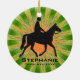 Horseback Riding Equestrian Personalized Ornament Christmas 20XX. An Equestrian poses on horseback against a green and orange starburst background. All text customizable, front and back!