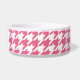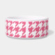 This ceramic dog food bowl has a stylish pink and white houndstooth pattern in the background. In the middle, there is a large white bone with an easily customized name of your doggie written in pink.
