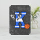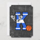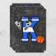Fun Basketball design for the young ice basketball player or basketball fan. Feature the letter K in blue and white team colors with Basketball high tops and basketball. Background features chalkboard design basketball terms and images
