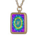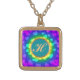 This vibrant, gold-toned square pendant necklace features a dazzling display of colorful hearts against a deep purple background. A prominent script letter "H" is centered within a teal circle, highlighted by a radiant yellow-green glow. The accessory is a playful and personalized statement piece, perfect for adding a pop of color and a personal touch to any outfit.