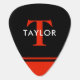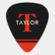 Modern personalized guitar pick featuring a black and red background, your initial, and name.