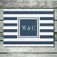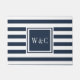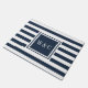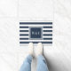 Elegant stylish personalized initials monogram doormat featuring a navy blue and white striped pattern with your initials set in a navy blue-bordered square with a classic white text. Personalize with your details and customize the color to the color of your choice. Designed by Thisisnotme©