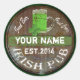 Easily Personalize this distressed wooden effect Irish pub sign made to look like an old beer barrel keg and green beer drinking graphic with a lucky green shamrock clover with your own text or name for your St Patrick's day drinking celebrations. Visit the PADDY_O_DOORS store to for matching products and more St Pat's day gifts. CLICK CUSTOMIZE to adjust the text size, or font you can also CLICK CUSTOMIZE to change the outer green rim background color from a range of over 200 colors.