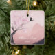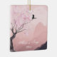 This holiday Christmas tree ornament features a spring Japanese style mountain landscape with a pink sunrise, a beautiful pink flowering tree. There is a crane taking off from a tree branch flying across the face of the rising sun. It can be personalized with a name, year or any text that you wish to add.