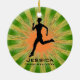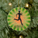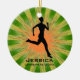 Jogging Running Personalized Ornament Christmas 20XX. An runner poses on a board against a green and orange starburst background. All text customizable, front and back!