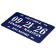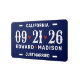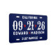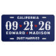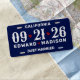 "Just Married" personalized white typography accented with red hearts on a royal blue background, a wedding license plate.
