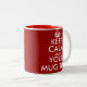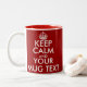 Personalized Keep Calm mug with customizable text. Cute gift idea for men and women. Customize background colors ie red. Create your own funny Keep Calm and Carry On parody. Simply edit the text of this template to make a unique design. Popular quotes: Keep calm and party on. Keep calm and love me. Keep calm and drink coffee. Personalized mugs are a great gift idea for friends and family.