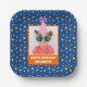 Celebrate your little one's birthday with a festive custom blue paper plate that features a fun display of orange and yellow stars and circles. Personalize this bright design with a photo of your little birthday boy or girl, complete with a cheerful pink birthday hat.