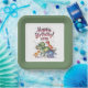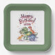 This cute personalized green dinosaur happy birthday square paper plates design shows adorable watercolor dinosaurs of various colors. This design also shows festive confetti as well as the phrase "happy birthday". You can add your name. The main color scheme is greens, reds, and blues. Enjoy this fun kids birthday party paper plates design!
