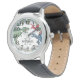 Jurassic themed kids watch featuring a plain white background, jungle green foliage, a collection of watercolor dinosaurs, your childs initial and name.