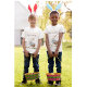 Make their holiday extra special with this personalized "Egg Hunting!" T-shirt featuring a whimsical white bunny in a blue checkered sweater. The front showcases the bunny carrying a full basket of colorful eggs through a meadow, while the back can be customized with a name and the title "the egg hunter". This soft, comfortable shirt is perfect for family photos and competitive egg hunts.
