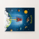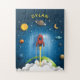 Add a child's name to this kids' jigsaw puzzle featuring a rocket ship blasting through clouds surrounded by planets