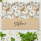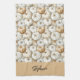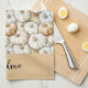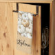 Personalized kitchen towel featuring a fall-themed design. The towel is decorated with a repeating watercolor pattern of pale orange and white pumpkins. At the bottom, there is a beige panel with your name in a stylish handwritten font, making it customizable. The overall look is festive, seasonal, and perfect for autumn cooking or holiday gatherings.