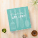 Personalized kitchen utensils recipe binder book. Custom cookbook with spoon, knife, whisk, spatula and personalizable color plus name. Cute personalized baking / cooking gift idea for women; ie mom, mother, mother, aunt, wife, sister, grandma, chef, friend etc. Country chic design with kitchen equipment design. Elegant typography for custom name. Cute modern Birthday or Holiday gift idea for dinner party. Also nice for weddings or bridal shower. Turquoise blue and grey color.