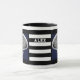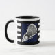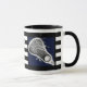 Unique lacrosse cup featuring lax stick art on navy blue background with black and white stripes. Edit text to add the name of your favorite lacrosse player, coach or team sports fan.