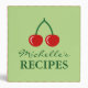 Personalized large recipe Binder with red cherry design. Cute kitchen recipe binder book with fruit print. Custom cookbook with big fruity icon and personalizable name. Cute personalized baking / cooking gift idea for women; ie mom, mum, mother, aunt, wife, sister, grandma, daughter etc. Elegant typography for custom name. Cute gift idea for dinner party. Also nice for wedding or birthday. Customizable background color.