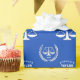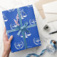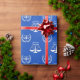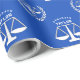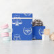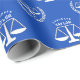 Creative law school grad gift wrap featuring scales of justice on a blue background. To personalize edit text to add graduate's name.