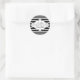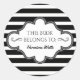Black and white modern, elegant bookplate label stickers- Black and white striped background. In the center is a an elegant emblem with charcoal edges and curlicues. Reads 'This Book Belongs to' in elegant lettering. Name in script underneath. Click Customize option to change text colors, size, and font styles. Even change the white stripes by changing the background color.