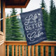 Welcome visitors to your woodsy abode or vacation home with this cute and cheerful flag featuring the phrase "life is better at the cabin in white lettering on a navy blue striped background accented with a deer and an arrow. Personalize with your family name and/or year established beneath.