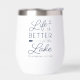 Celebrate life at your seaside abode with this cute personalized wine tumbler featuring the phrase "life is better at the lake" in navy blue lettering accented with an anchor and an oar. Customize with your family name and/or year established beneath.
