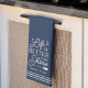 Celebrate life at the beach with this cute coastal personalized kitchen towel featuring your family name and/or year established beneath "life is better at the shore" adorned with paddle and nautical anchor illustrations. Rope detailing completes the design.