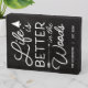 Welcome visitors to your forest abode with this cute and cheerful wooden box sign featuring the phrase "life is better in the woods" in white lettering accented with a pine tree and an arrow. Personalize with your family name and/or year established beneath.
