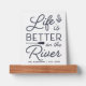 Decorate your riverside abode with this art and ledge combo featuring the phrase "life is better on the river" in deep navy blue lettering accented with a nautical anchor and an oar. Personalize with your family name and/or year established beneath.