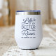 Celebrate life at your riverside abode with this cute personalized wine tumbler featuring the phrase "life is better on the river" in navy blue lettering accented with an anchor and an oar. Customize with your family name and/or year established beneath.