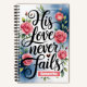 Celebrate God’s unwavering love with this elegant watercolor typography featuring the phrase 'His Love Never Fails,' adorned with vibrant roses and flowing elegant bold calligraphy style. personalized with name.