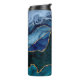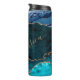 Beautiful personalized thermal tumbler features lux agate and gold vein patterns in peacock colors of blue, green, purple and turquoise.