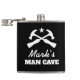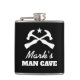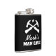 Personalized man cave hip flask drink gift for men. Customizable black background color. Cool manly Birthday gift idea for guys. Personalize it with a name or monogram initials. Alcohol / Drinking presents for him. Masculine hammer tool logo design with bold text. Perfect for best dad, husband, uncle, grandpa, step dad, friend, boss, coworker, boyfriend etc.