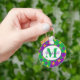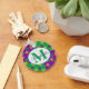 This colorful key chain features a pattern of purple, green, and gold fleur-de-lis symbols. The name and initial can be customized as you wish. The two sides of the keychain can be customized independently. (Color codes: Purple = 8c0daa; Green = 0dab48; Gold = f0d100)