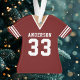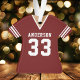 Celebrate your favorite football player or team with this personalized maroon and white jersey ornament. Perfect for commemorating a winning season, special player, or team. Customize it with a name and number to create a unique keepsake.